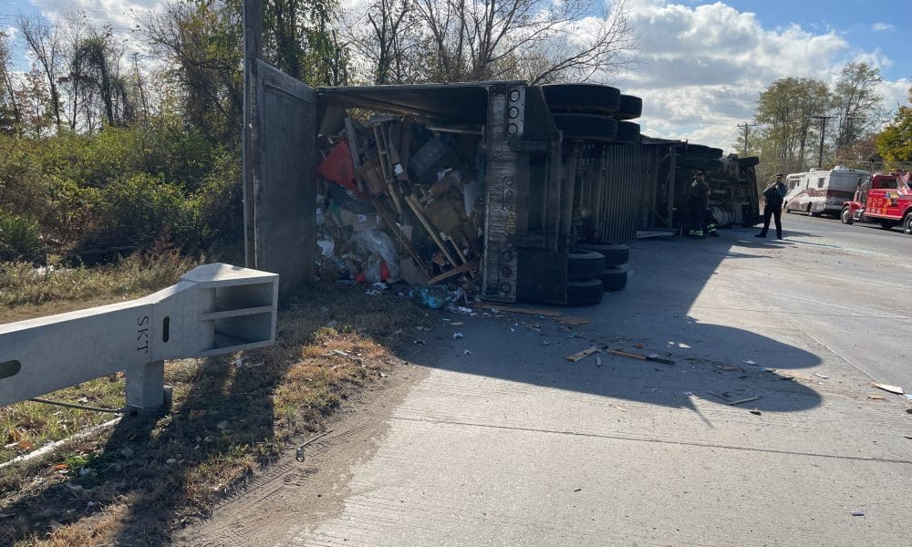 A tractor trailer carrying household garbage that overturned, sliding across the roadway striking a pickup truck waiting at a redlight, was caused by a failure to...