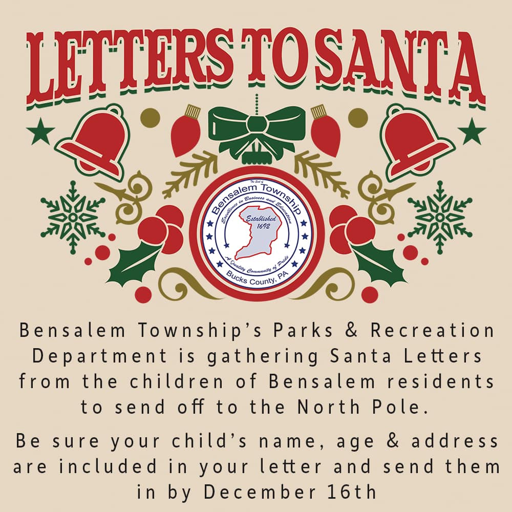 Bensalem Township’s Parks & Recreation Department is gathering Santa Letters from the children of Bensalem residents to send off to the North Pole. You can drop your letter in our special mailbox- located in the front lobby or mail them directly to: