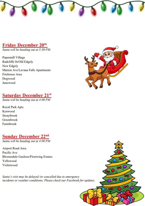 Here is the 2024 Santa Schedule. Times and dates subject to change due to weather and fire emergencies. Edgely and Santa look forward to seeing you all !!! See flier for places and times.