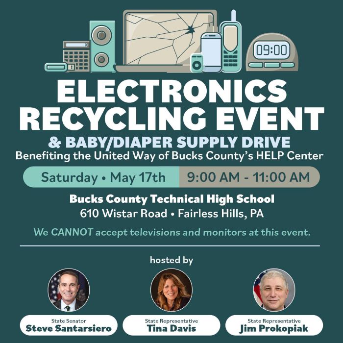 Sen. Steve Santarsiero is partnering with Rep. Tina Davis and Rep. Jim Prokopiak to host an Electronics Recycling & Baby Supplies Drive on Saturday, May 17th. From 9-11am we’ll be at Bucks County Technical High School collecting electronics for recycling.