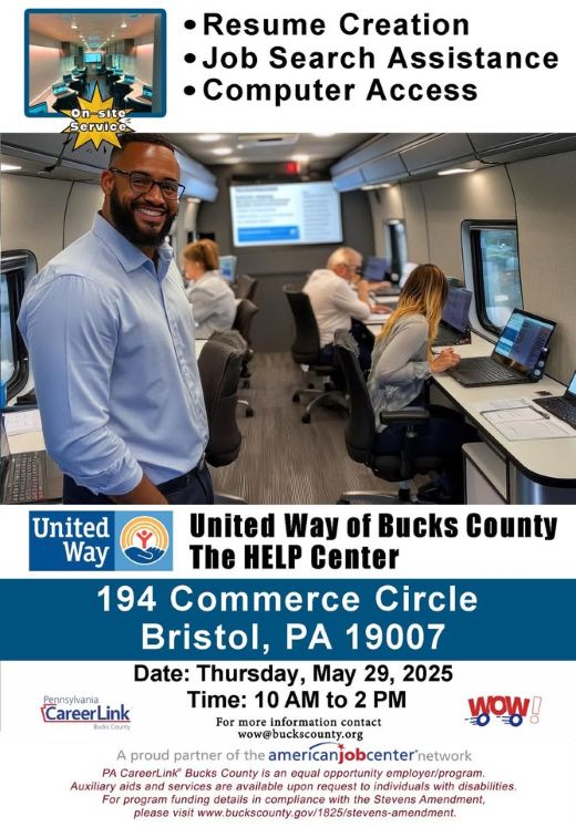 PA CareerLink invites the public to the event that will be located at property United Way of Bucks County’s HELP Center on 194 Commerce Circle in Bristol.