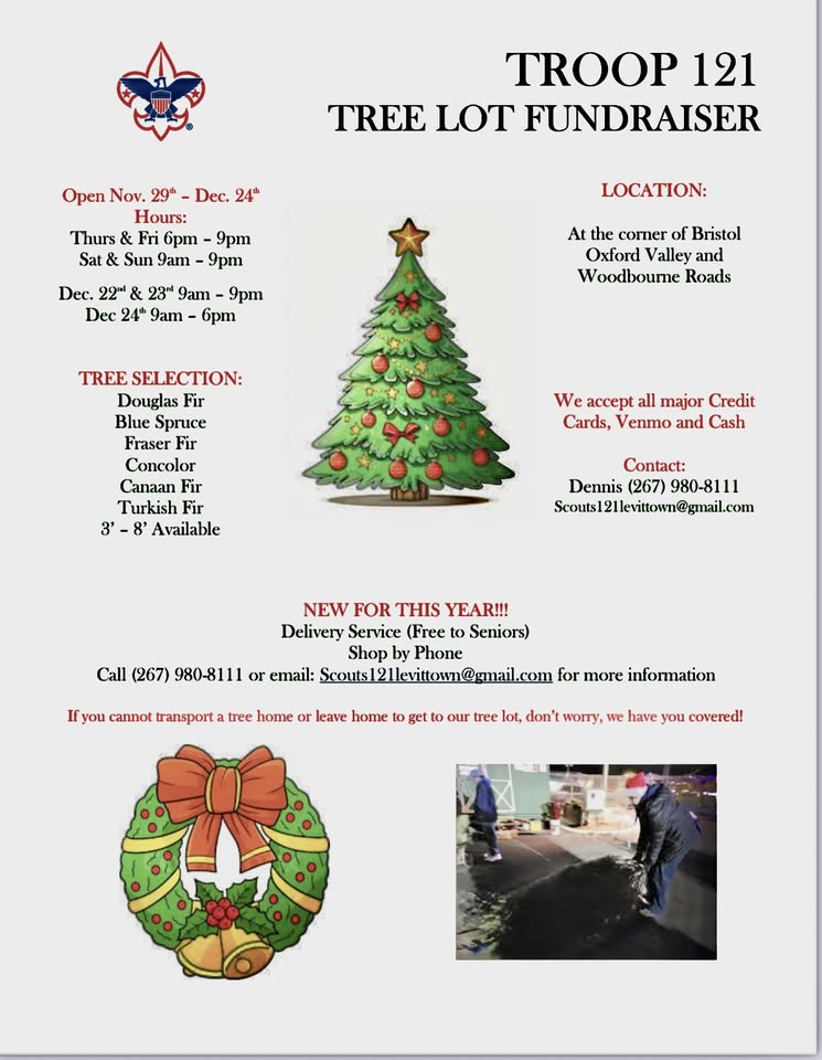 From Troop 121 Christmas Tree Lot Group: Christmas is coming – and so are the Christmas trees! – This holiday season, please consider supporting a local nonprofit instead of the big box stores. When you choose to shop with us, you’re helping keep opportunities alive for our Scouts.
