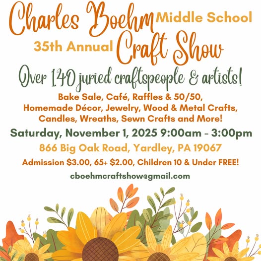 Charles Boehm Middle SchoolSave the Date for the 2025 Charles Boehm's PTO 35th Annual Craft Show on Saturday November 1 2025 from 9am to 3pm at 866 Big Oak Road in Yardley! From the PTO: Applications for 2025 are no longer being accepted. - Vendor locations will be communicated in early October. Please reach out to us at cboehmcraftshow@gmail.com with any questions or […]