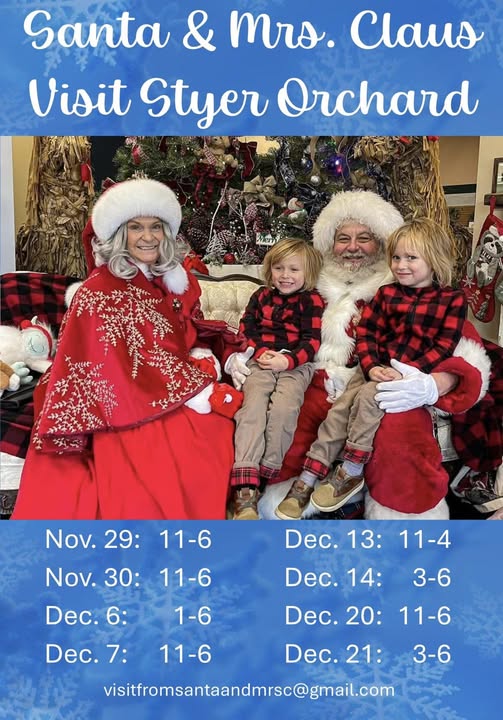 Santa and Mrs. Claus Visits to Styer Orchard