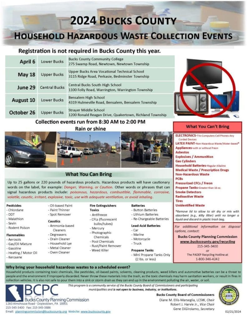 The fourth of the Bucks County Planning Commission’s five 2024 Household Hazardous Waste Collection Events is slated for Saturday, Aug. 10 at Bensalem High School.