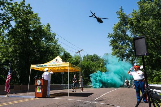 During a planned flyover on Tuesday, June 24, 2025, a UH-1C helicopter passes above the dedication ceremony for the WO1 William H. McDonnell Memorial Bridge. The gunship was similar to the one flown during McDonnell’s final mission. Credit: Bucks County Government